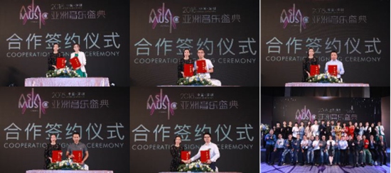 见证辉煌,勇攀高峰,活动接近尾声,也迎来了本次发布会的最后一个环节战略合作签约环节,由主办方代表亚洲音乐盛典组委会主席张盈柔女士与新加坡虹桥陪服国际教育创始人Abby、联合主办方深圳市泓美文化传媒有限公司总经理姚立峰、承办方深圳远见无限文化传媒公司董事长刘玉新、承办方深圳大视界文化产业集团董事长吴啸、协办方深圳唯天下影视传媒有限公司总经理何昌炜分别签署战略合作协议。此次战略合作的签约,预示着强强联合,也预示着亚洲音乐盛典将开启新纪元。