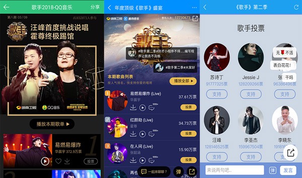 《歌手》第九期中,每一位唱将的选曲以及演绎都独具故事和看点,每一首歌曲都被歌手们赋予了不同的音乐理念与情感,歌手们如此努力与用心,力求为歌迷呈现出完美的竞演及好听的音乐,错过《歌手》节目的歌迷们,可以通过腾讯音乐娱乐集团旗下的QQ音乐、酷狗音乐、酷我音乐三大平台聆听歌手们的用心之作。另外,腾讯音乐娱乐不仅对《歌手》音源Live进行零时差收录,同时还配合了评论、榜单等互动,粉丝们在听歌之余,还可以在三大平台的《歌手》投票专区,为自己喜爱的爱豆在线投票,助力其荣登榜首。